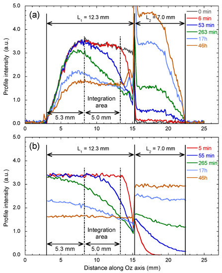 Magnetic Resonance Imaging (MRI) experiments were also performed by using 1H NMR spectroscopy to obtain long time-scale information on the macroscopic mobility of water molecules within clay porous media made of kaolinite particles [51]; see the Supplementary Materials for more details. The experimental conditions are selected to probe a total length of 25 mm. The porosity of the dry kaolinite sample ( = 0.52) is evaluated by helium pycnometry [51]. The clay sample is initially saturated with bulk water, leading to a total length (noted L) of 12.3 mm (see Figure 20a). The MRI experiment starts just after the addition of a limited amount of heavy water (length L = 7 mm) on the top of the hydrated clay sediment, leading to a total length (L = 19.3 mm) fitting the experimental window. As illustrated in Figure 20a, the 1H water concentration profiles exhibit some attenuation of the 1H NMR signal at the bottom of the clay sample because a significant section of the clay sample (5.3 mm) is located outside the optimal detection area of the detection coil. We also detect alterations of the water concentration profile near the clay/heavy water interfacial area, further limiting the useful length of the hydrated sample to 5 mm. By integrating the 1H NMR signal over the corresponding limited area (see Figure 21), we obtain information of the long time-scale, s, implied in this exchange between bulk and heavy water. Numerical simulation are performed [51] to fully validate that analysis (see Figure 20b and Figure 21) by using the porosity of the dry clay sample and the water mobility previously measured by 1H PGSE attenuation measurements (see Section 2.4 above). That result clearly illustrates how MRI experiments may be used as complementary tool to probe the mobility of confined molecules over a broad macroscopic time-scale (from minutes up to day).