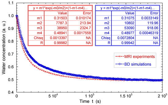 Direct comparison of the time evolutions of the measured and simulated numbers of confined water molecules. Experimental and numerical data are fitted by a biexponential law: , where are constants. Reprinted with permission from Ref. [51]. Copyright (2018) American Chemical Society.