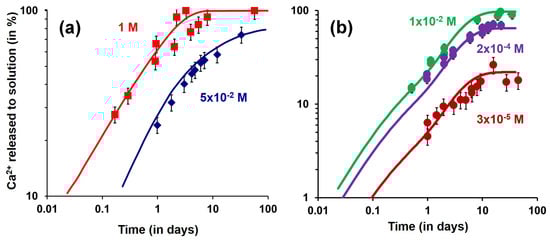 Out-Diffusion experiments were performed to determine the time-scale characterizing the exchange between Ca2+, initially located in the interlayer of vermiculite disks and neutralizing its charge, and Na+ or Sr2+, present in aqueous solutions [53,54] (see Figure 22 and the Supplementary Materials for more details). Firstly, the resulting exchange rates between these counterions were well predicted by BD simulations using self-diffusion coefficients for interlayer and aqueous bulk cations, calculated from preliminary MD simulations and the geometry of both aqueous reservoir and vermiculite disks (see Figure 22a) in the case of the Ca2+/Na+ exchange [53]. The results of this study showed that the time-evolution of the concentration gradient of interlayer Ca2+ was the main driving force interpreting exchange rates measured at all aqueous reservoir salinity investigated, while limitation at the solid/liquid interface, due to diffusion in the aqueous reservoir, can acts as a limiting factor to interpret exchange rates measured at low salinity conditions. As displayed in Figure 22b, the same experimental data were also well reproduced by a classical finite-volume model based on continuous differential equations, constrained by a self-diffusion coefficient of the slowest interlayer cation. That approach uses also selectivity coefficients obtained independently in batch and describing the ionic exchange at thermodynamic equilibrium (see Ref. [54] for more details). Using the two numerical approaches (BD and classical finite-volume model based on continuous differential equations), data were always based on self-diffusion coefficients obtained from preliminary numerical simulations of Molecular Dynamics (MD) without the use of any fitted parameter [53,54]. As displayed in Figure 22, the agreement between experimental and numerical data validates the use of self-diffusion coefficients obtained from MD simulations to predict the dynamic of the exchange between interlayer cations and aqueous ones over several days (up to 20 days) and then the multi-scale approaches proposed.