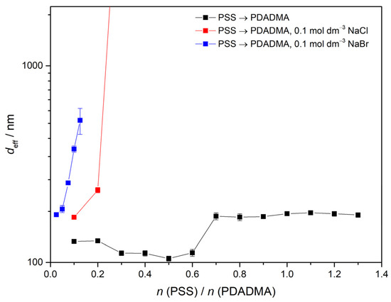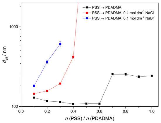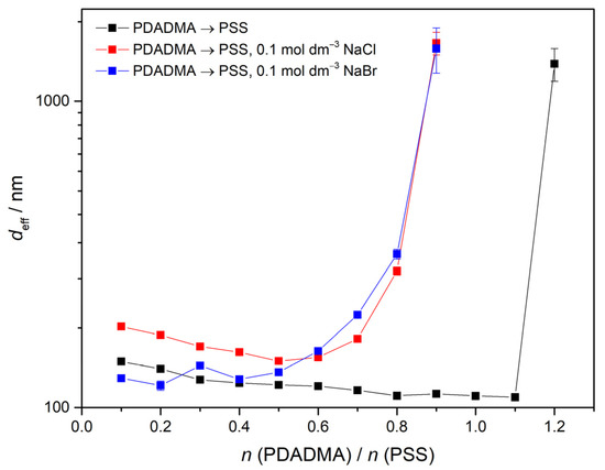 In the case when titration was performed in the opposite direction (i.e., polyanion to polycation addition) (Figure 2), the corresponding titrant to titrand ratio, where an abrupt increase in size was observed, was lower when NaCl or NaBr was added to polyelectrolyte solution. More importantly, there was a significant difference between two salts, so we can state that in the case of positive complex formation, a counteranion effect is present. As bromides influence the corresponding ratio more, they are getting more condensed to the polycation chains than chloride anions. This is also in accordance with previous reported results in aqueous solution [52].