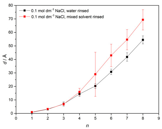 From the results presented in Figure 5, the increase in thickness with each deposited layer of prepared multilayers could be observed. Furthermore, the difference between multilayer’s formation in 0.1 mol dm–3 NaCl after rinsing with water compared with mixed solvent rinsing can be observed after the 4th layer. Multilayers that were rinsed with solvent between each deposition step were thicker than those rinsed with water.
