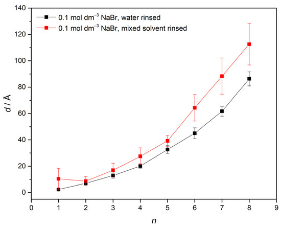 A similar rinsing effect can be observed in the case of NaBr solution (Figure 6). This difference in thickness obtained with two rinsing protocols could be explained by the exchange of the solvent in the multilayer. As the solvent polarity affects condensation and conformation of polyion chains, larger thickness increments could be expected for PEMs prepared from the mixed solvent of lower polarity (polyelectrolyte chains tend to obtain more globular conformation). In both used preparation methods, PEMs formed in NaBr solution are significantly thicker than those formed in NaCl solution. In addition, the standard error of average thickness value is larger in the case of bromide, indicating higher surface roughness. This could be due to the more pronounced condensation of bromide anions to the polycation chain, which is in accord with the herein presented results in solution.