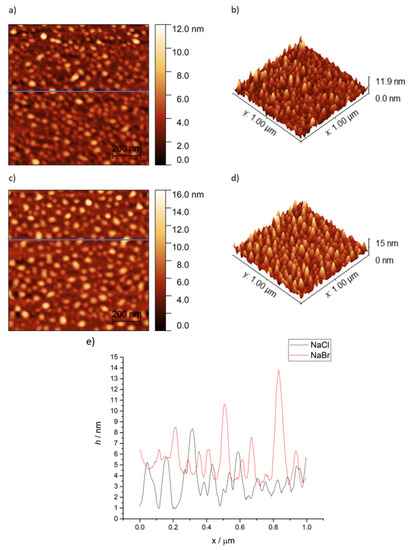 As in the case of the mixed solvent, a different morphology and surface roughness was observed in the case of PEM prepared from NaCl and NaBr solution (Figure 11). In the case of NaCl, surface roughness has a value of Rq = 1.08 ± 0.07 nm, while in the case of NaBr, Rq = 1.35 ± 0.07 nm.
