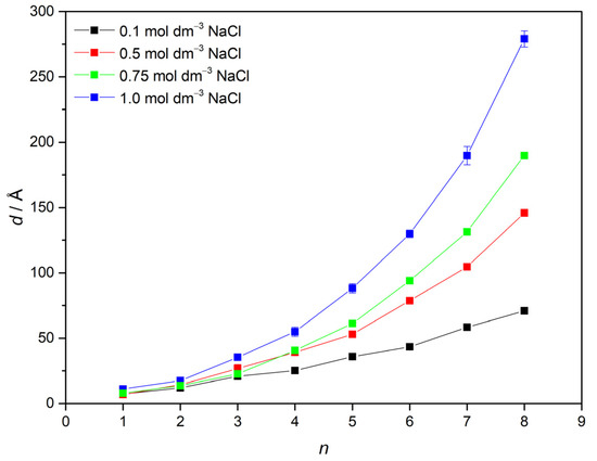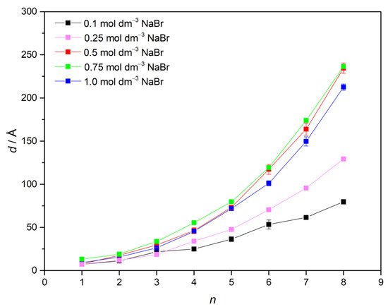 Figure 8 shows that higher ionic strength causes the increase in multilayer thickness. Moreover, in the first few steps of multilayer growth, it can be described as linear, while later on as exponential. Following experiments with sodium chloride, the same were investigated in the presence of sodium bromide.