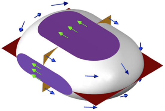 The main method used to study flow fields in microfluidic drops is micro-particle image velocimetry (μ-PIV) [22,23,24,25,26,27,28]. In most studies, flow fields were measured at the middle plane of the channel. A thorough 3-D reconstruction of flow patterns inside a drop moving through a rectangular channel (with an aspect ratio of 0.58) was carried out in [23], using confocal µ-PIV when the ratio of dispersed phase viscosity, µd, to continuous phase viscosity, µc, was equal to µd/µc = 0.23. Flow fields were measured for several horizontal cross-sections and then the vertical components of the flow velocity were calculated from the continuity equation. The flow was found to have a complicated 3-D structure, with liquid near the walls moving more slowly than the drop, whereas the liquid in contact with continuous phase in the corners moved faster than the drop. The methodology was developed further using multicolor confocal micro-PIV [24], which enabled simultaneous measurement of flow fields in both phases. The generalized distribution of surface stresses (and surface flows) in the presence of corner flow is shown in Figure 1 [28].