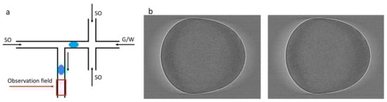 A schematic of the microfluidic device is shown in Figure 2a. The rectangular channels have a width, W = 346 ± 3 µm, and a height, H = 167 ± 3 µm, with the aspect ratio, A = H/W = 0.48. Considering that PDMS is prone to swelling in silicone oil, the device was kept filled with continuous phase for 1 week prior to use, but there was still a rather slow decrease in the channel size afterward, reflected in the given deviations for H and W.