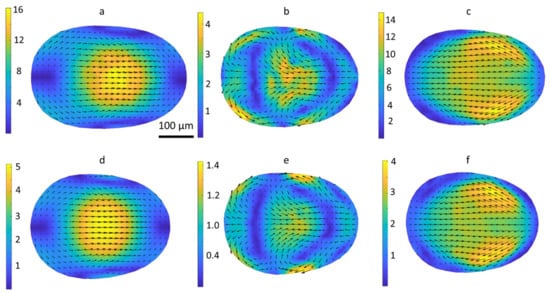 Flow fields inside a drop in the co-ordinate frame of the drop: top panel, surfactant-free, total flow rate Q = 96 µL/min, Ca = 0.040, drop length L = 430 ± 20 µm, drop velocity Vd = 34.1 ± 0.8 mm/s, (a)—middle plane, (b)—60 µm from the middle plane, (c)—80 µm; bottom panel, C10TAB, 1.5 cmc, Q = 32 µL/min, Ca = 0.037, drop length L = 397 ± 6 µm, drop velocity Vd = 11.1 ± 0.3 mm/s, (d)—middle plane, (e)—60 µm from the middle plane, (f)—80 µm. The velocity on color scales is given in mm/s.