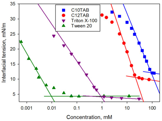where σ is the equilibrium interfacial tension at a bulk concentration of the surfactant c, σ0 is the interfacial tension of a surfactant-free system, R is the universal gas constant, T is the absolute temperature, Γ∞ is the maximum adsorption, Γ is the equilibrium adsorption at concentration c, and b is the adsorption constant. The parameters of Equations (1) and (2), Γ∞ and b, together with the values of critical micelle concentration (CMC) and interfacial tension at CMC found in Figure 5, are collected in Table 2. The CMC values for ionic surfactants in the water/glycerol mixture are larger than for solutions in water [46], which is in line with other studies [47,48]. CMC for Triton X-100 is also larger than data from the literature [46] and from the supplier for solutions in water, 0.6 mM.