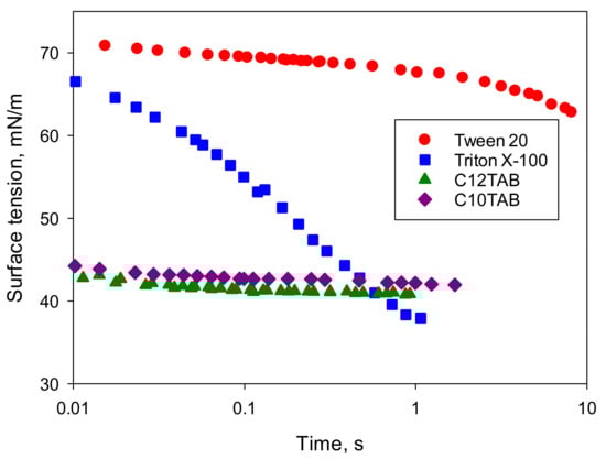 Characteristic diffusion lengths and timescales for the surfactants used in this study, at a concentration equal to the CMC, are presented in Table 2. The validity of calculated timescales is supported by Figure 6, where the dynamic surface tension (aqueous phase/air) is presented for surfactant solutions at the CMC in the glycerol/water mixture (a concentration of 0.06 mM was taken for Tween 20). The characteristic timescale of adsorption should be rather similar for both aqueous/air and aqueous/SO interfaces, because the surfactant diffusion coefficient and concentration (CMC) included in Equation (4) are the same, and the values of maximum adsorption presented in Table 1 are quite close to those for an air/water interface (see, for example, [46]). Figure 6 shows a very short adsorption time for both ionic surfactants, with equilibration time being below the timescale of measurement. For TX-100, Figure 6 shows an equilibration time below 1 s, whereas for Tween 20 it is much larger than the time of measurement. At a timescale of 10 s, the surface tension is only slightly smaller than the surface tension of a surfactant-free glycerol/water mixture.