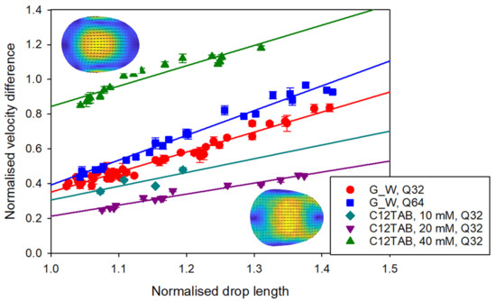 Dependence of normalized velocity difference in the middle plane on normalized drop length for surfactant-free dispersed phase and various concentrations of C12TAB. Q32 corresponds to the total flow rate Q = 32 µL/min, and Q64 corresponds to the total flow rate Q = 64 µL/min.