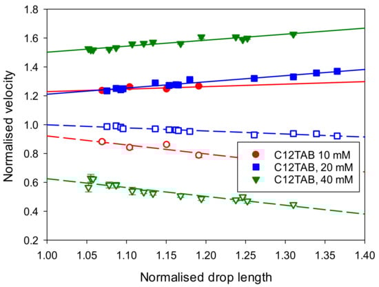 The transition in the flow patterns is accompanied by a change of the drop shape from bullet-like, with a large difference in curvatures between the front and rear of the drop, to nearly symmetrical (compare Figure 3 and Figure 4, see Figure S3 for comparison with C10TAB-laden drops of 80 mM and 120 mM) and a noticeable, ~10%, increase in the drop velocity.