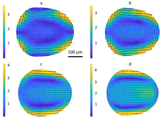 Flow patterns within the drop laden with Triton X-100, at a concentration of 0.3 mM ~ 0.3 CMC. Drop length L = 392 µm, total follow rate Q = 32 µL/min, drop velocity Vd = 9.6 mm/s, (a)—middle plane, (b)—40 µm from the middle plane, (c)—60 µm, (d)—80 µm.