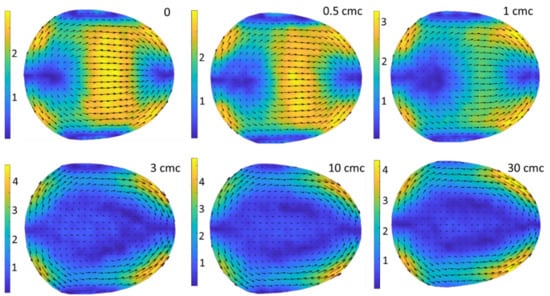 A similar transition was observed for Tween 20. As shown in Figure 10, with an increase in surfactant concentration, the flow velocity in the central part of the middle plane decreases, due to the growing retarding effect of the corner flow, and flow reversal occurs at a concentration of 3 CMC = 0.18 mM. The flow patterns remain unchanged for a further concentration increase from 3 to 30 CMC. Unlike the flow in the central part, the symmetrical areas of large flow velocity at the front and rear parts of the drop, which are related to the interaction of the drop flow field with the continuous phase (mostly the corner flow (compare Figure 4, Figure 9 and Figure 10)), remain in place with an increase in concentration. The flow distribution in the various cross-sections is similar for Triton X-100- and Tween 20-laden drops, as illustrated by a comparison of Figure 9 and Figure S4.