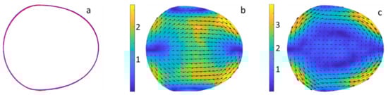 To verify that the flow patterns depend on dynamic effects related to the surfactant redistribution, rather than on interfacial tension at the time of drop observation, the velocity fields in two similar drops, laden with Tween 20 and C12TAB, were compared. The chosen drops have the same length, L = 368 µm, are moving with the same velocity, Vd = 9.8 mm/s; moreover, they have the same shape in the middle plane of observation, as shown in Figure 11a. This suggests that the interfacial tension is the same for the two drops, i.e., the interfacial tension for the Tween-laden drop is ≥19.1 mN/m, considerably higher than the equilibrium interfacial tension at this concentration (even accounting for surfactant depletion from the bulk). This agrees with the high value of characteristic diffusional adsorption time given in Table 2 and shows that, probably, the thickness of the adsorption layer inside the drop was underestimated, or that adsorption kinetics are not purely due to diffusion. Despite the similar (dynamic) interfacial tension, the flow patterns inside the two drops are very different (compare Figure 11b,c); thus, the changes in flow fields observed inside Tween 20-laden drops are due to dynamic effects caused by surfactant redistribution. As patterns within Tween 20- and Triton X-100-laden drops are similar, we assume that dynamic effects are also of importance for the Triton X-100-laden drops.