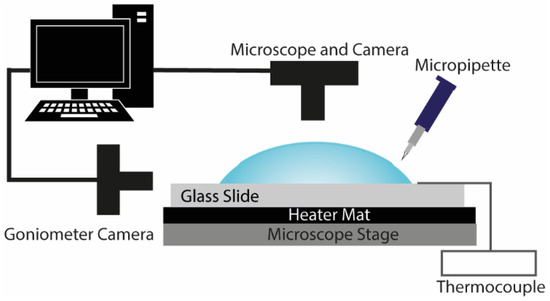 Glass microscope slides (MS/1 Scientific Glass Laboratories Ltd., Stoke-on-Trent, UK) were placed in an ultrasonic bath containing deionized water for 15 min, rinsed with ethanol (Ethanol 99%+, Absolute, Fisher Scientific, Loughborough, UK) and dried using an air gun. Sessile drops of FBS (1.2 ± 0.2 μL) were gently placed on the glass slides and left to dry at different substrate temperatures. The initial contact angle between the liquid drops and the substrates was 35 ± 5°. The substrate temperature was controlled (PID control) via the use of a heater mat (SRFRA-4/10-230V, Omega Engineering Ltd., Manchester, UK), placed underneath the glass surfaces, and a thermocouple mounted on the slide surface (Figure 1). Both the ambient temperature and the relative humidity (RH) levels were monitored during the experimental procedure via the use of a temperature-humidity meter (HH311, Omega Engineering Ltd., Manchester, UK). RH levels were 45% ± 5% during the experiments, and the ambient temperature was 20 ± 1 °C.