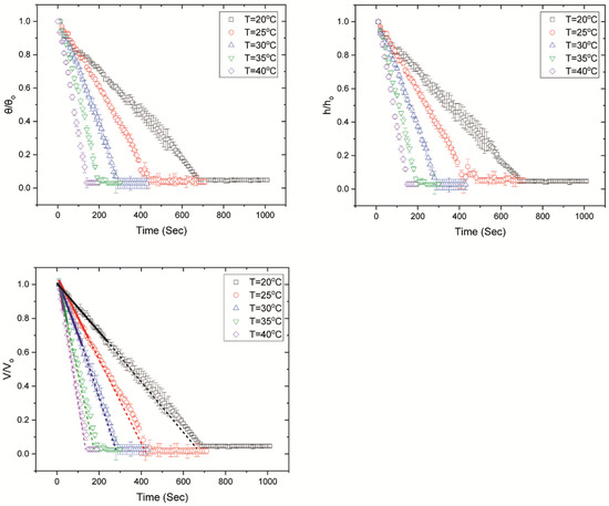 Temporal evolution of the normalised contact angle (θ/θο), height (h/ho) and volume (V/Vo) for FBS drops evaporating at different substrate temperatures. The volume decreases linearly indicating an almost constant evaporation rate until the onset of gelation (continuous lines) [48,49], when the evaporation rate decreases slightly (dashed lines). The volume remains constant throughout crystallisation and cracking. We show the volume during crystallisation and cracking, although the resolution of the experimental apparatus is not high enough to track volume changes during these stages. It should be noted that, because the volume is estimated from the side profile of the drying drops, there is an overestimation of the volume after the formation of the peripheral ring. The average times for the onset of gelation are ~250 s, ~163 s, ~129 s, ~66 s and ~38 s for drops evaporating on glass slides with temperatures of 20 °C, 25 °C, 30 °C, 35 °C and 40 °C, respectively.