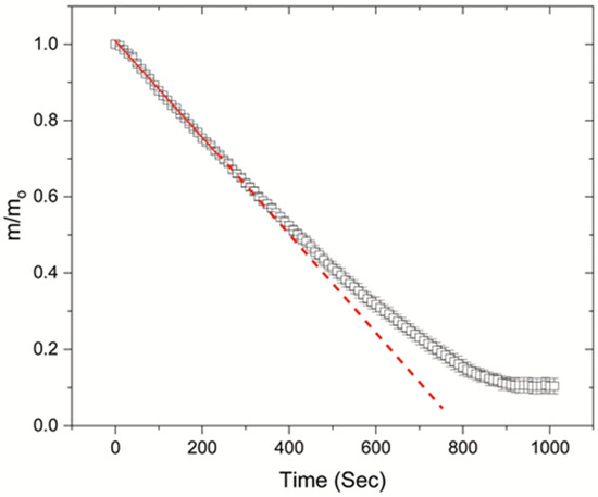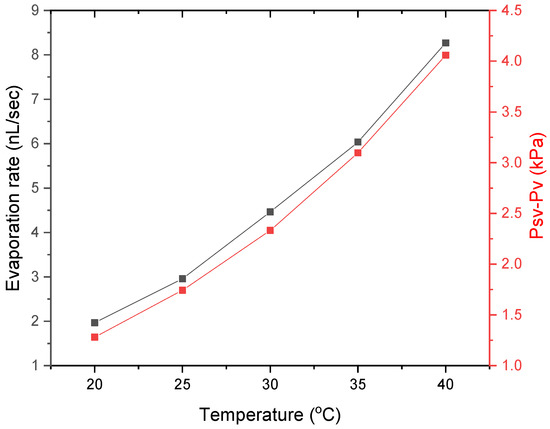 The evaporation rate increases with increasing substrate temperature and can be described by a second order polynomial trend, as shown in Figure 5. The evaporation rate should be proportional to the driving force concentration difference () which may be described in terms of mole fraction, molarity or partial pressure [53]. In our case, the evaporation is driven by vapour pressure through diffusion, hence, the driving force is the pressure difference (Δp). For any substrate temperature, during pre-gelation, the evaporation rate should be proportional to the pressure difference Δp, which was calculated as, where is the saturated vapour pressure of pure water at each examined substrate temperature and is the partial pressure of water due to relative humidity at the same temperature. Relative humidity (RH) is given by: