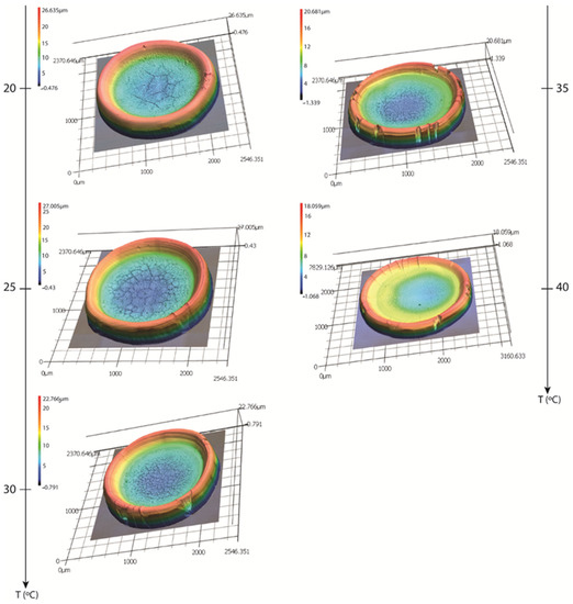 The topography of the dried deposits was investigated using confocal laser scanning microscopy (Keyence VK-X1000). Figure 8 shows 3D representations of the final deposits for each examined substrate temperature.
