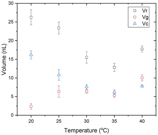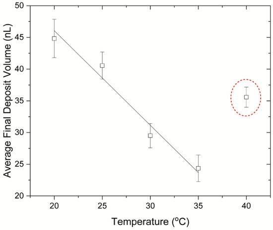 Average volumes of the final desiccation deposits based on the substrate temperature during evaporation. The dashed ellipse shows the anomaly observed at 40 °C, when the volume of the final deposit increases.
