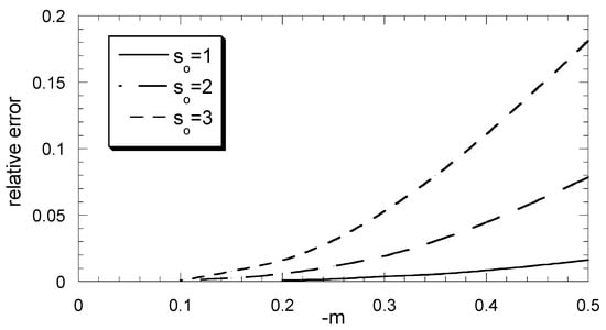 In Figure 1, the relative error of the moments method for the total particle mass is shown at the time when the remaining total particle mass is 10% of its initial value. The procedure to construct this graph is the following: First, Equation (3) with i = 1 and M1 = 0.1 is solved with the Newton–Raphson method to find the required time τ and then system (4) is integrated over this time to find the approximate value of M1. The relative error is given as (M1/0.1 − 1). This error is shown versus exponent m for three values of sο, as depicted in Figure 1. As it is expected, the greater the sο, the larger the error. A characteristic of the negative exponent m is that, consistently, Mo < M1, whereas for the gravitational removal (m > 0), it is always M1 < Mo. The computation showed that the corresponding Figure 1 error for the Mo is much smaller than that of M1. The assumed extent of the process is rather large (90% of the total mass deposited) and covers all the possible applications of the method. For larger extents, the total mass of the particles remaining in the flow is too small to require a highly accurate computation. In other words, if the relative error in Figure 1 was transformed to an absolute error (fraction of the initial total mass), it would be 10-times smaller.