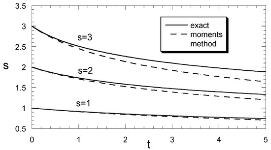 The initial distribution is assumed to be log-normal with dispersity so. In summary, the exact solution for the moments can be found from integral (3), whereas the approximations are obtained from system (4). Integration is performed by an explicit Runge–Kutta integrator [10]. The prespecified relative accuracy is set equal to 10−5. It is noted here that the application of the log-normal method is not restricted to removal rates, for which a closure of the moment equation can be achieved. In the case of a general complex form of the removal rate, system (4) contains integrals over the log-normal profile. These integrals can be readily integrated numerically through the Gauss–Hermite quadrature. The log-normal method is one with three degrees of freedom. In certain complex applications, moment methods of even lower orders are employed (e.g., monodisperse with two degrees of freedom) [11,12].
