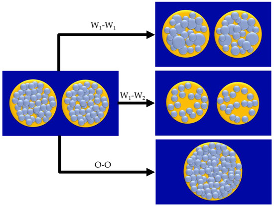Double emulsions tend to be more unstable than single emulsions due to the two differently curved interfaces [3]. These interfaces must be stabilized against three different coalescence paths, as shown in Figure 1 [4]. From the idealized starting point on the left side, the following coalescence mechanisms can occur: W1–W1, the coalescence of inner water droplets; W1–W2, the release of inner water droplets into the continuous phase; and O–O, the coalescence of (filled) oil droplets. To prevent or slow down coalescence, at least two surfactants are added. To keep the inner water droplets emulsified within the oil, most research is performed on the oil-soluble surfactants polyglycerol polyricinoleate (PGPR) and Span 80 [5]. For stabilizing the oil droplets, a variety of different water-soluble surfactants were applied and compared in different studies [6,7]. These ranged from short-chained ionic [8] and non-ionic [9] surfactants over synthetic polymers [10] to biopolymers, such as pectins and proteins [11]. Since the two different surfactants distribute at both interfaces and build mixed films, the resulting stability of a double emulsion is dependent on how well the two surfactants interact at the interfaces [12].
