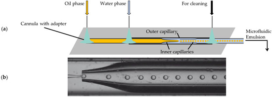 Microfluidic emulsions were produced by a glass capillary system with coaxial glass capillaries. Figure 2 shows a draft of the setup. The construction used here was developed for the production of double emulsions, since three phases can be pumped into the chip simultaneously, and was used in previous studies [37,38]. In this study, the chip is used for single emulsion in co-flow break-up, with an additional downstream flow constriction, as described by Dewandre et al. [39]. The advantage of this setup for the production of single emulsions compared to counter flow is that there is no need for complex surface modifications of the capillary tips to adjust the wettability [39].