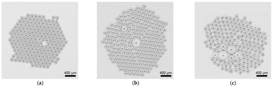 Figure 3 shows three exemplary pictures of microfluidic emulsions after different numbers of coalescence events. Each droplet is labelled with its diameter in pixels, determined using a MATLAB code [40]. In Figure 3a, the emulsion still has a monomodal droplet size distribution. In Figure 3b, some of the droplets coalesced and the droplet diameter increased. In Figure 3c, the break-down of the emulsion is further progressed. To calculate how many coalescence events per 100 droplets occurred, the initial droplet number n0 of the diameter d0 that resulted in nt droplets of the diameters di can be calculated by the Formula (1):