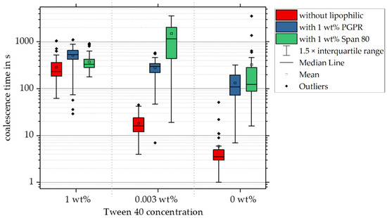 Coalescence time of single droplets in box plot diagram form. The box shows the middle quartiles, while the whiskers mark the upper and the down quartile. Additionally, the outliers and mean value are plotted. On the x-axis, the concentration of Tween 40 is varied. In the oil phase, either PGPR, Span 80 or no lipophilic surfactant were added. With decreasing concentrations of Tween 40, the stability of oil droplets decreases. Additional lipophilic surfactants can help to stabilize the water droplets.