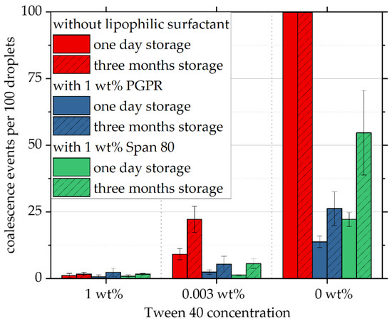 At a reduced Tween 40 concentration of 0.003 wt%, the number of coalescence events increased. In the sample without lipophilic surfactant, approximately a quarter of the droplets coalesced within three months. With additional lipophilic surfactants, fewer coalescence events were observed the number was still below 7 coalesced droplets per 100 after 3 months. The two lipophilic surfactants showed a comparable stability within the measurement accuracy. The additional adsorption of PGPR and Span 80 obviously enhanced the droplets’ stability.