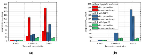 Single and double emulsions were produced with a colloid mill with identical process conditions and were measured for their droplet sizes directly after production and after two weeks of storage time. In Figure 6, the characteristic value x90,3 of the droplet size distributions of the single emulsions (a) and of the double emulsions (b) are shown. Double emulsions without lipophilic surfactants could not be produced, since the inner emulsion separated instantly. The x90,3 values for these formulations are therefore not plotted in Figure 6b.