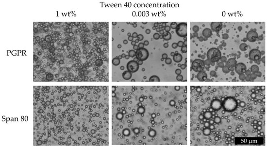 In the top row, double emulsions stabilized with PGPR are shown. With decreasing Tween 40 concentration, the oil droplet sizes decreased, as discussed above. The droplets were all grey, with some visible inner droplets, which means the double emulsion structure was intact. The Span 80-stabilized inner water droplets were no longer visible; the oil droplets were brighter, indicating that there were no inner water droplets. Pictures with higher magnification confirmed the absence of inner droplets. Although many studies using Span 80 for double emulsions are available [48,49,50], in our study, no double emulsion could be produced with this lipophilic surfactant.