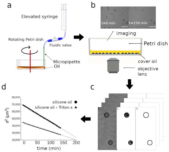 The workflow of droplet diameter measurements. (a): The droplets are generated by a water filled micropipette immersed in a rotating Petri dish containing oil. (b): The Petri dish with the w/o emulsion is placed on an inverted microscope and images are taken in time-lapse mode. Scale bars indicate . (c): Image stacks are segmented to detect and track the droplets. (d): Diameter of droplets is automatically measured to plot the curves of droplet dissolution.