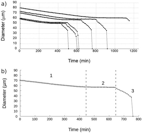 (a) Data showing the change of the diameter of water droplets under mineral oil from a bottom view as observed by the objective lens of an inverted microscope. Different curves correspond to different droplets. (b) The three distinctive phases of a representative curve.
