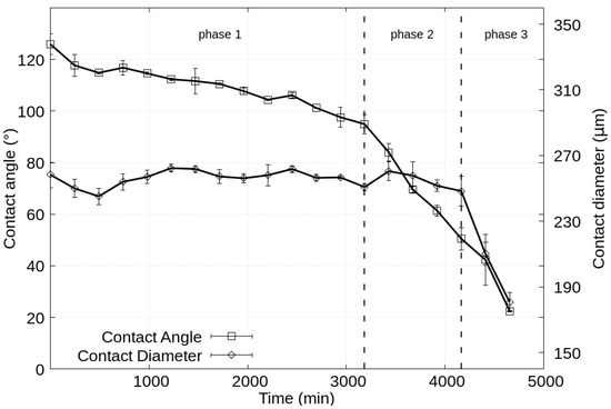 Then the hydrophobic Petri dish containing the w/o emulsion of thousands of droplets was placed onto an inverted microscope and let to sediment for . Time-lapse images were recorded to simultaneously observe multiple, similarly sized droplets under the same conditions. The change of the diameter of six individual water droplets under mineral oil can be seen in Figure 3a. Supplementary Video S1 shows the phenomenon in case of two droplets. A perfect immiscibility between water and oil would dictate a constant size, however, time-lapse recordings show a gradual dissolution of the droplets. As indicated by a representative curve, the decrease in the diameter of the droplets from a bottom view occurs in three distinct stages (labeled with numbers 1–3) beginning with a linear decrease, followed by a stagnating phase, and ending with a rapid decrease (Figure 3b). In order to better understand this phenomenon, we executed another type of experiment: a water droplet placed under mineral oil was imaged from side view using a contact angle measurement setup. In both experiments the droplets were deposited on a hydrophobic plastic Petri dish surface, exhibiting an initial contact angle higher than . The change of the contact angle and the contact diameter imaged from a side view can be seen in Figure 4. It is apparent that the contact area between the droplet and the surface does not change in phases 1–2, but it quickly shrinks in the final phase 3 of droplet dissolution.