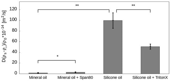 Values of of the four different oil mixtures we investigated in depth. For each material the data shown corresponds to a linear fit of five different droplets under the same conditions. Errors were calculated as the standard deviation of the five slopes. Significance levels: **: , *: . Values of are the following. Mineral oil: ; mineral oil with Span80: ; silicone oil: ; silicone oil with Triton X-100: .