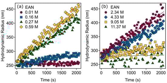 Time-dependence of the hydrodynamic radii measured by DLS for SL particles in EAN–water mixtures at different EAN concentrations on the water-rich side (a) and on the IL-rich side (b). The solid lines present the linear fits to the data used to calculate the aggregation rate constants according to Equation (2).
