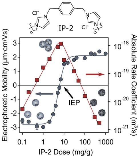 Furthermore, the absolute aggregation rate coefficients were determined by time-resolved DLS measurements under the same experimental conditions as the electrophoretic mobilities to explore particle aggregation processes in the dispersions. Figure 2 indicates that the gradual decrease in the mobility values is in line with the changes in the absolute aggregation rates. Accordingly, when the particles possess high electrophoretic mobility values (either negative or positive), the aggregation rate values are low indicating the stable dispersions or slow aggregation. However, at IP-2 doses near to the IEP, the rate values increase indicating a rapid particle aggregation and hence, unstable samples. Such a charging and aggregation behaviors resemble the one observed earlier in oppositely charged polyelectrolyte–particle systems [31,36,44,45] and are in qualitative agreement with the DLVO theory, which predicts the stable dispersions in case, when the surface charge is high and the corresponding repulsive double layer forces prevail the attractive van der Waals interactions [46].