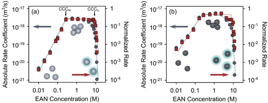 This scenario is similar to the one induced by the simple inorganic salts [30,47,48], since the ILs tend to fully dissociate and hydrate in dilute aqueous solutions, similar as observed for the inorganic electrolytes [21,30,49]. The sharp transition between the reported fast and slow aggregation regimes is located at the so-called critical coagulation concentration (). Therefore, this parameter can quantify the destabilization power of the given solvent medium. The obtained values in the water-rich regime () are expressed as molar concentrations of EAN (Table 1), but those in the IL-rich regime () are expressed as molar concentration of water. They were determined from the data presented in Figure 3 and are gathered in Table 1. The presented findings are generic for both SL (see Figure 3a) and SL-IP-2 particles (see Figure 3b).