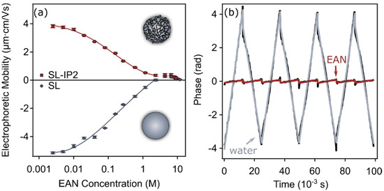 Charging characteristics of polystyrene latex particles in EAN–water mixtures. Electrophoretic mobility values of SL and SL-IP-2 particles at different EAN concentrations (a) and the obtained phase plots in the presence of SL particles on the water-rich side (2.5 mM EAN concentration) and IL-rich side (0.17 M water concentration) (b). Phase plots showing the phase difference between the detector trace and the monitor trace (black lines), while the grey (water) and red (EAN) lines indicate the cmPALS fit to the data. The solid lines in (a) represent the interpolation according to Equation (4).