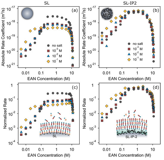 Besides, Figure 5a further indicates that the presence of the ions seems to stabilize the SL dispersions in the intermediate concentration regime in EAN–water system, where the viscous stabilization occurs, since the aggregation rates in the presence of salt ions tend to be almost one order of magnitude smaller than in the case when the simple electrolyte is not present. Another noteworthy observation is that this stabilization is more pronounced with increasing amount of ions, e.g., the aggregation rates were the lowest at the presence of 0.1 M . This trend can be partly explained by the accumulation of ions on the negatively charged SL particle surface and thus, they are most probably involved in the development of the initial cationic layer, which compensates the negative charge of the SL. As ions can interact with the EAN components at the interface, they contribute to the formation of ordered solvation layers around the particle and consequently, also to the development of more stable particles. Similar scenario was observed for different solid/IL interfaces in the presence of inorganic ions [33,61]. In general, the influence of added ions can be attributed to their affinity with cations, anions, and the particle surface, to their size compared to that of the components of the IL and to their interaction with water.