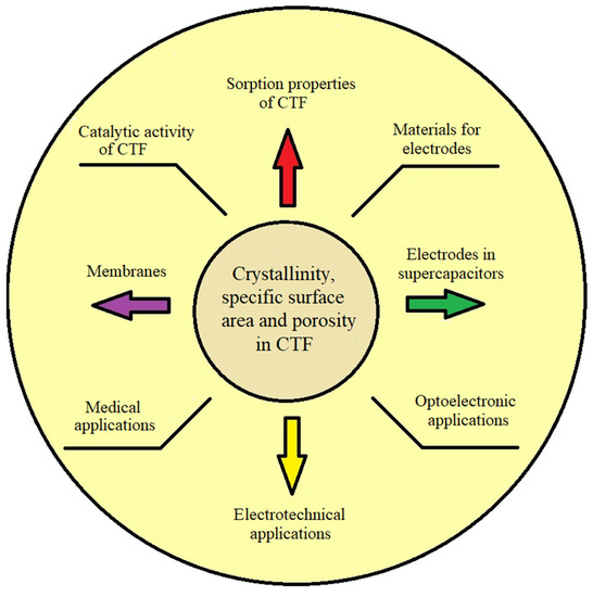 If it is required to obtain CTFs with the largest values of SSA and porosity (with largest), one should preferably reject crystallinity and a system of conjugated bonds. A covalent organic framework based on triazine was synthesized under solvothermal conditions [70]. The SSA of this polymer was 882 m2 g−1, which is not low for crystalline CTF.