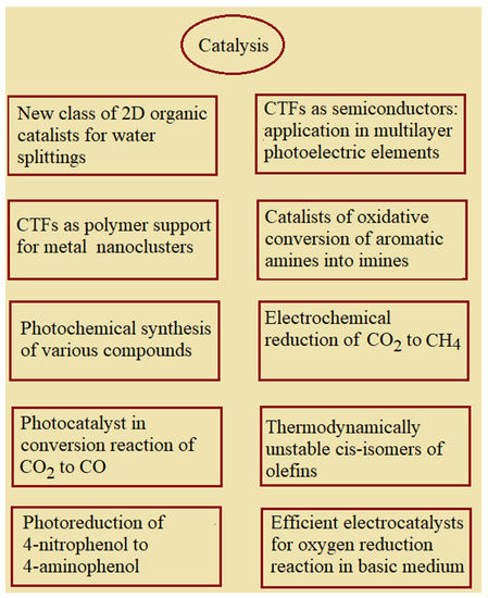 As shown in [138,139,146], imine-based CTFs possess good absorption properties and can be used for the extraction of dyes and chlorophenols from various industrial waste waters.