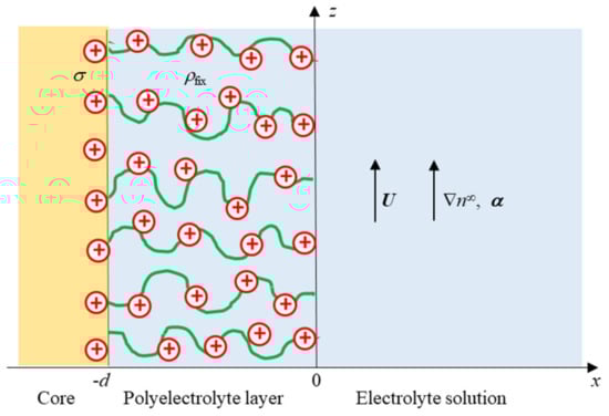 Let us consider a soft particle, i.e., a hard particle covered with an ion-penetrable surface layer of polyelectrolytes with a thickness d and with a diffusiophoretic velocity U in an aqueous liquid solution of viscosity η and of relative permittivity εr containing an electrolyte under a constant applied gradient of electrolyte concentration (Figure 1). The electrolyte is of the Z:Z symmetrical type with valence Z but may have different ionic drag coefficients λ+ and λ- for cations and anions, respectively. We assume that the polyelectrolyte layer, in which charges are distributed with a uniform density ρfix (when ρfix = 0, the surface layer consists of uncharged polymers). We adopt the Brinkman–Debye–Bueche model [,]. In this model we regard polymer segments in the polyelectrolyte layer as resistance centers, exerting frictional forces on the liquid flowing in the polyelectrolyte layer. The x-axis is considered to be normal to the particle core with its origin x = 0 at the front edge of the polyelectrolyte layer, and the z-axis is considered to be parallel to the particle core, as shown in Figure 1.