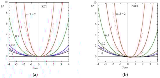 Figure 2 shows some examples of the results of the calculation of the scaled diffusiophoretic velocity U* of a soft particle with a thick polyelectrolyte layer in an aqueous KCl solution (β = −0.02) and in an aqueous NaCl solution (β = −0. 2) as a function of the scaled Donnan potential yDON for various values of the ratio κ/λ of the Brinkman shielding length 1/λ to the Debye length 1/κ, calculated with Equation (52) (solid lines). Results obtained with a low potential approximation with Equation (56) are also given (dotted lines) in Figure 2, which shows to be a good approximation for |yDON| ≤1.