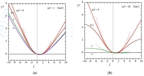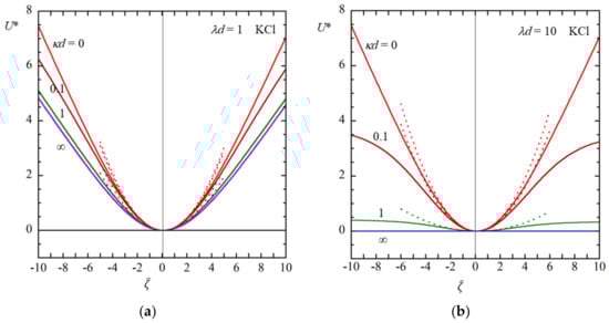 Figure 3 and Figure 4 show some examples of the results of the calculation of the scaled diffusiophoretic velocity U* of a soft particle in an aqueous KCl solution (β = −0.02) (Figure 3) and in an aqueous NaCl solution (β = −0.2) (Figure 4) as a function of the scaled zeta potential for several values of κd at λd = 1 (a) and λd = 10 (b), calculated with Equation (61) (solid lines). Results obtained with a low potential approximation with Equation (66) are also given (dotted lines) in Figure 3, which shows to be a good approximation for || ≤ 2.