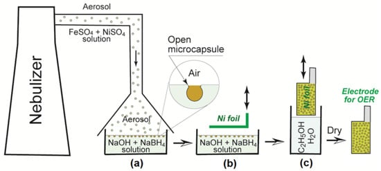 The microbubbles of hydrogen can also be formed at the outer wall of such microcapsules. They are released on the surface of the nickel—iron hydroxide nanoparticles as a result of the BH4− anions hydrolysis, and those microbubbles possibly prevented the microcapsules from the submersion in the alkali solution. It should be particularly noted that the size of the obtained microcapsules practically corresponds to the size of the microdroplets in the aerosol generated by the applied device, which confirms this sequence model of the chemical processes during the microcapsule formation.