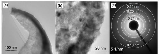 In Figure 2b,c, it can be seen that the outer surface of the VLM consisted predominantly of spherical nanoparticles with size of 10–20 nm, whereas the inner surface contained the same nanoparticles along with the planer ones, with the lateral size of up to 50 nm. The investigation of the microcapsule walls by means of transmission electron microscopy (Figure 3a,b) actually confirmed the noted nanoparticles sizes. Moreover, the analysis of the high-resolution micrographs revealed that the nanoparticles were crystalline (not shown in this figure). Unfortunately, it was not possible to obtain direct information on the interplanar distances in these experiments due to the so-called moiré pattern effect. At the same time, the electron diffraction study revealed that the nanoparticles were characterized by the interplanar distances of 0.24, 0.20, 0.14, and 0.10 nm (Figure 3c). According to [18], those values are close to the interplanar distances in β-Ni(OH)2 with a trigonal crystalline structure and the m point groups.