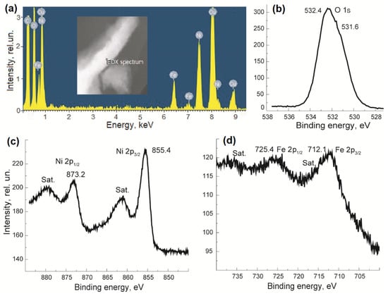 EDX spectrum (a) and XPS O1s (b), Ni2p (c), and Fe2p (d) core levels spectra of nanoparticles forming the microcapsule wall.
