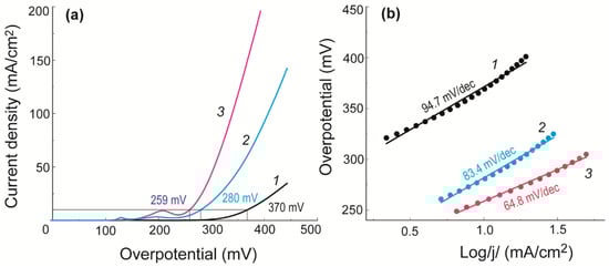 OER polarization curves (a) and Tafel plots (b) of the nickel electrodes. 1—nickel foil, 2—the layer of NiFe0.3(OH)x nanoparticles on the nickel foil surface obtained by the drop-casting method, 3—NiFe0.3(OH)x VLM on the surface of nickel foil.